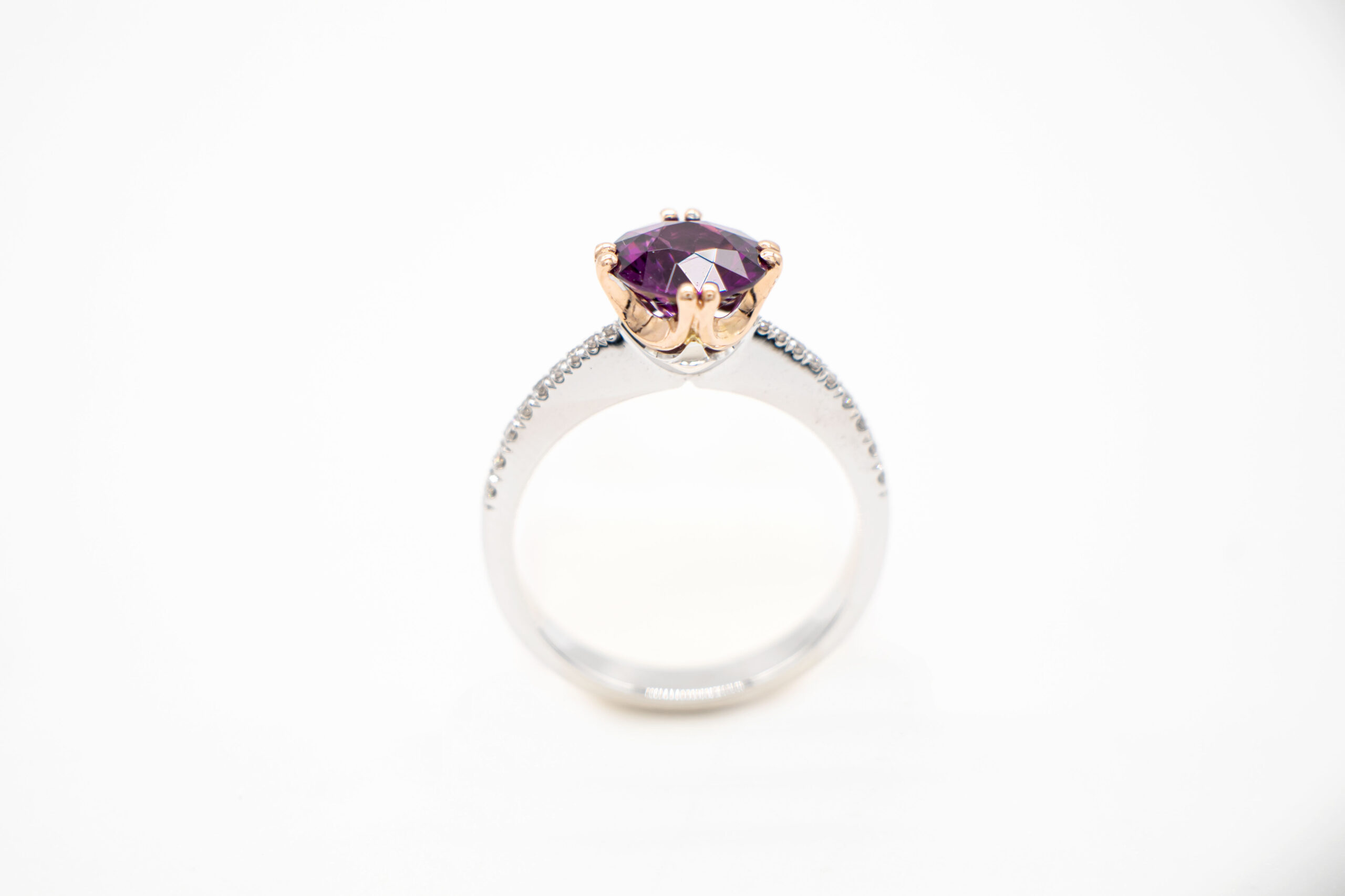 Atelier Heldwein “1902” Ring with Royal Purple Garnet and Diamonds 4.8g 750/000 White Gold/Rose Gold Diamond Brilliant 0.15ct. Royal Purple Garnet 2.17ct. Ring size 55