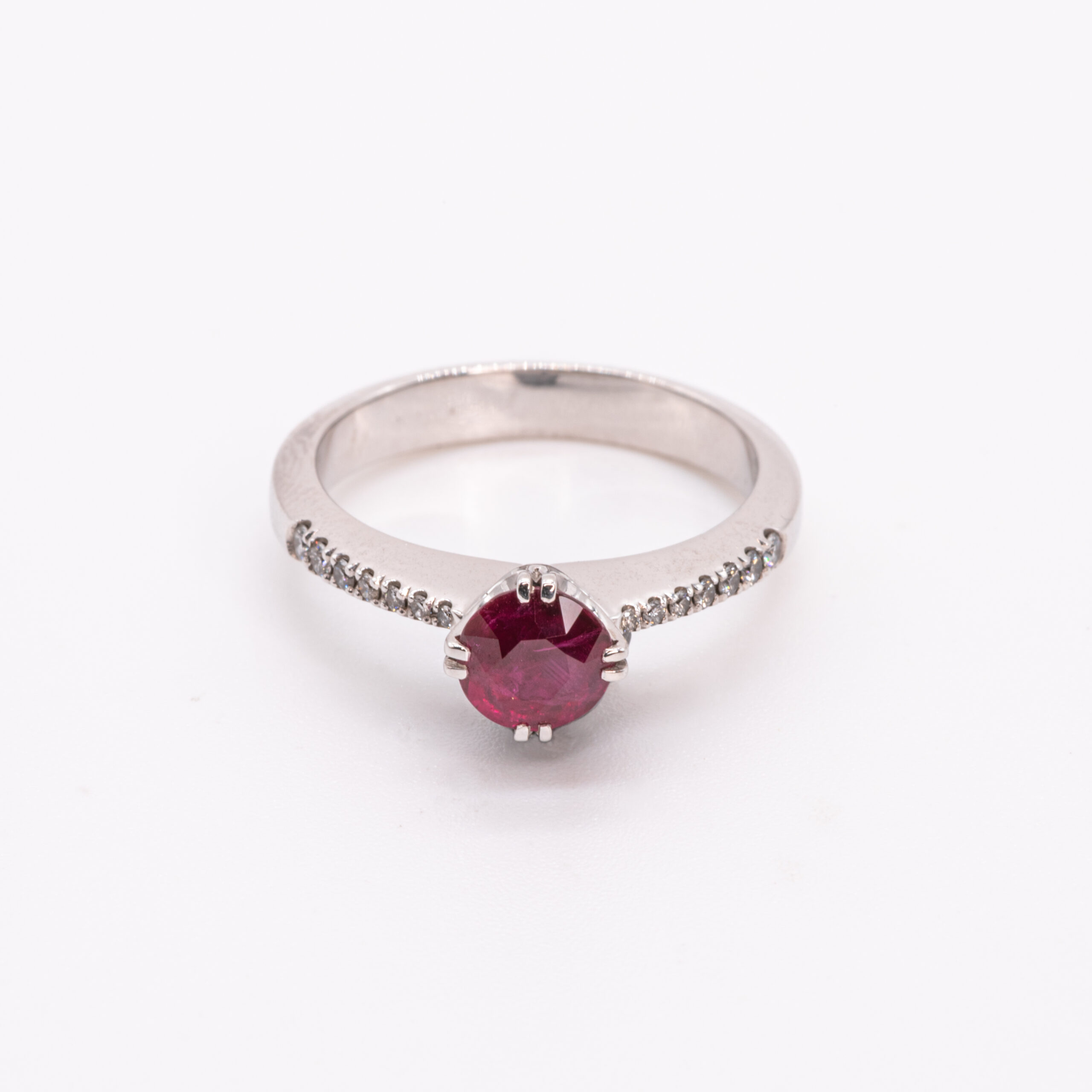Atelier Heldwein “1902” ring with ruby and diamonds 1 ruby faceted 1.01ct. 14 Diamond F/G VVS 0.10ct. 5.20gr 18 carat/- white gold Ring size 53