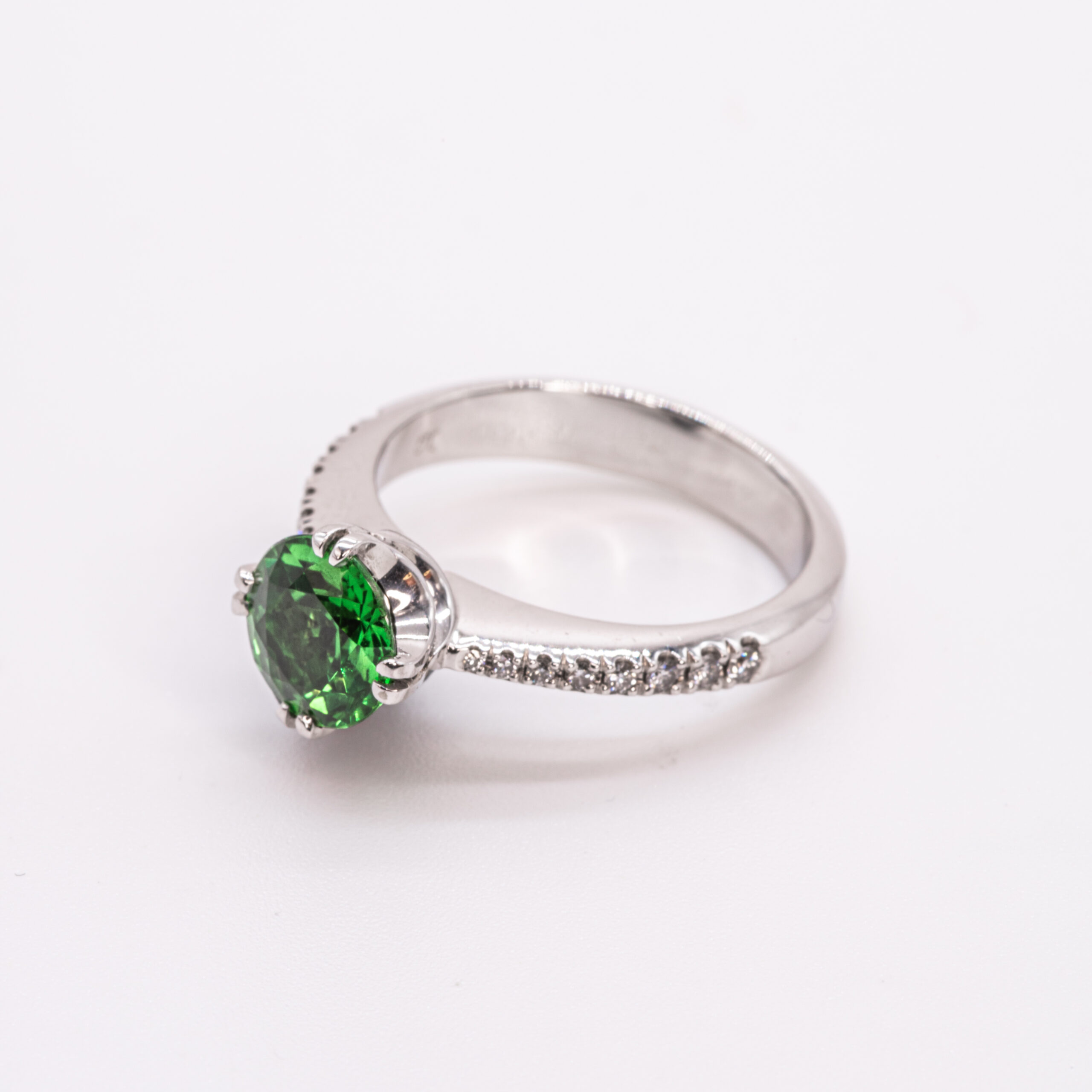 Atelier Heldwein “1902” ring with tsavorite and diamonds 18 carat/- white gold 6.35g 16 diamond F VVS brilliant 0.14ct. 1 Tsavorite Green Brilliant 1.72ct. Ring size 54