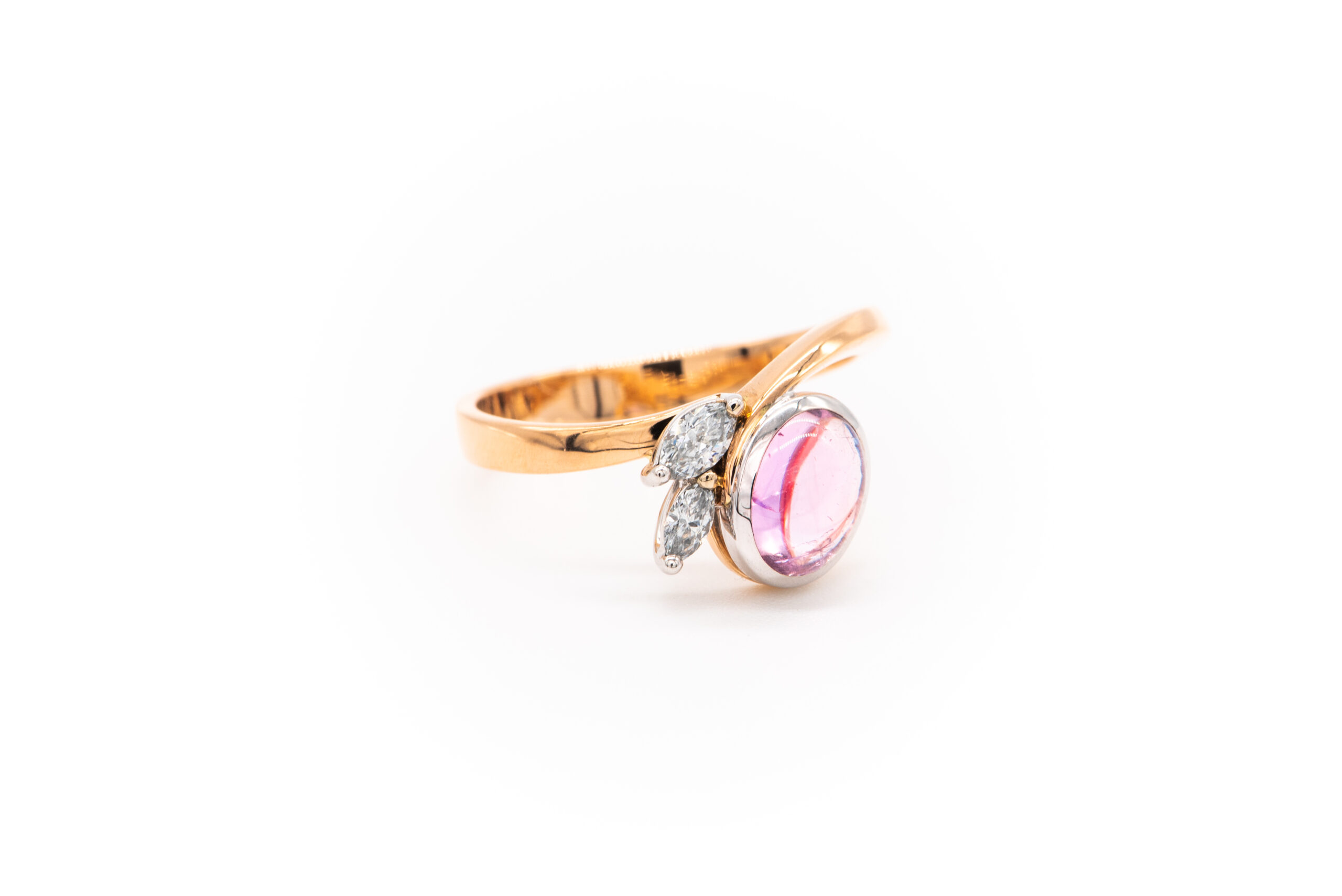 Atelier Heldwein “La Fleur” ring with morganite 3.55g 750/000 rose gold/white gold diamond G/F VVS Marquise 0.07ct. Diamond G/F VVS Marquise 0.11ct. Morganite Cabochon 1.17ct. Ring size 55