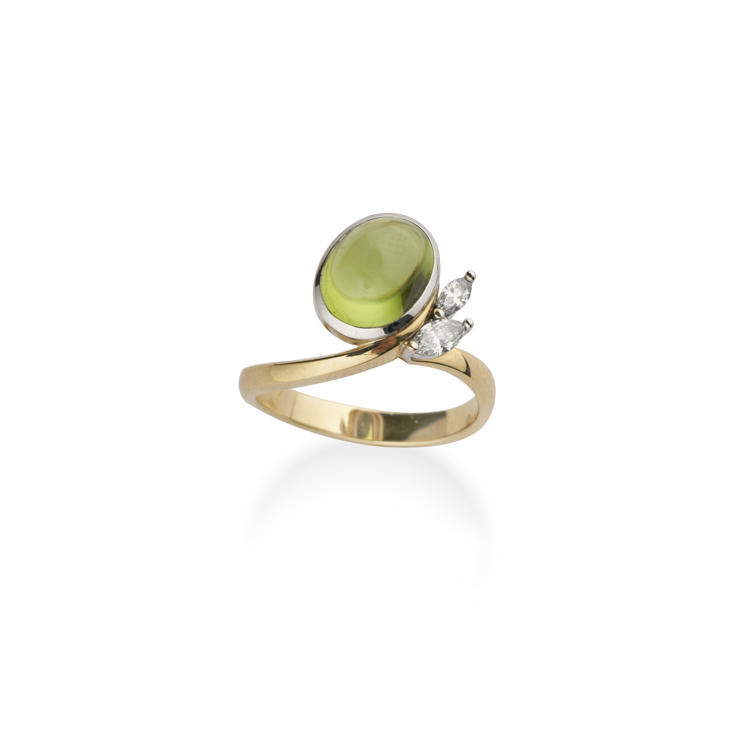 Atelier Heldwein “La Fleur” ring with peridot 4.85g 750/000 white gold/yellow gold diamond G/F VVS Marquise 0.07ct. Diamond G/F VVS Brilliant 0.11ct. Peridot Cabochon 3.39ct. Ring size 55
