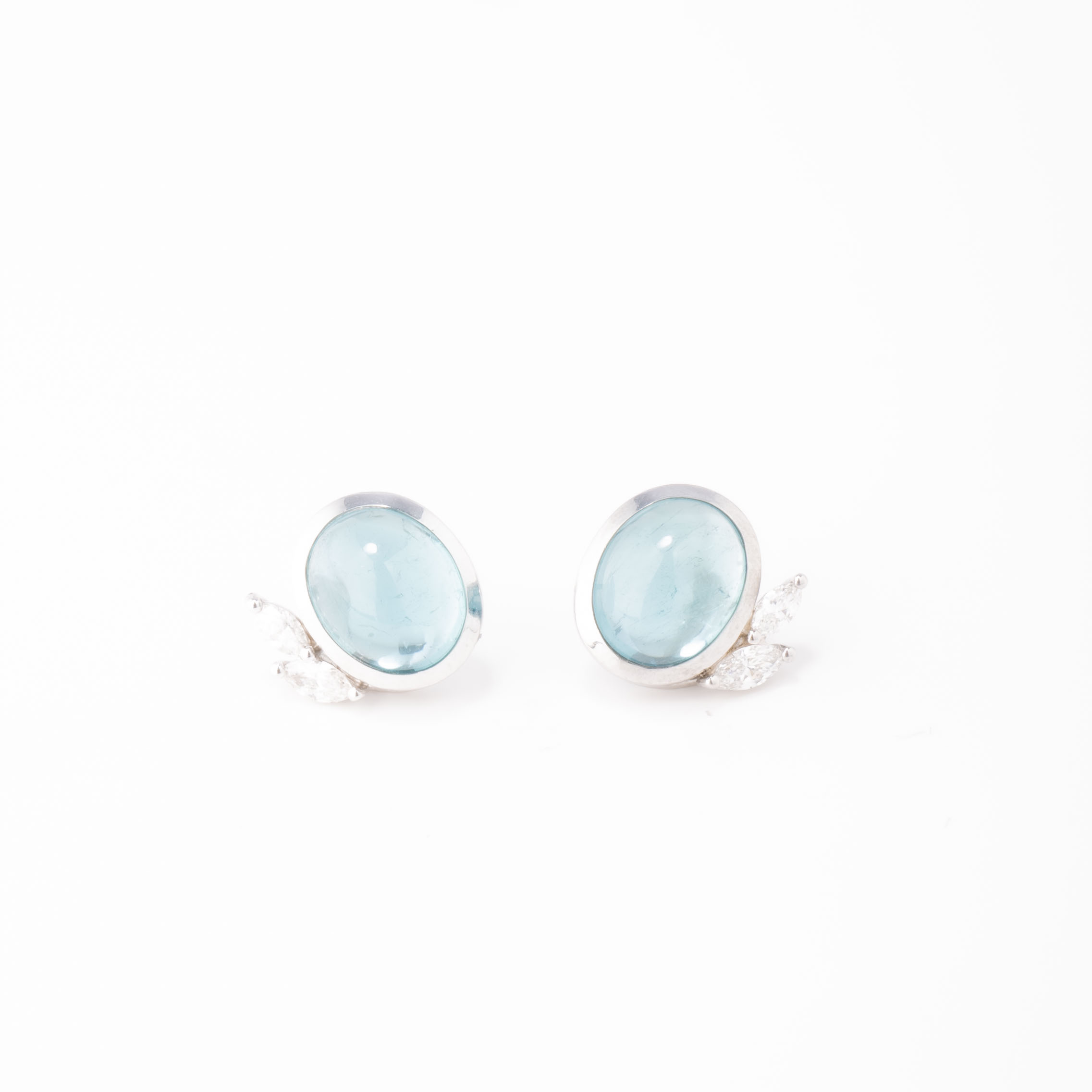 Atelier Heldwein “La Fleur” stud earrings 4.6g 750/000 white gold 2x diamonds marquise total 0.14ct. 2x diamonds marquise total 0.21ct. 2x Tourmaline blue cabochon total 7.21ct.