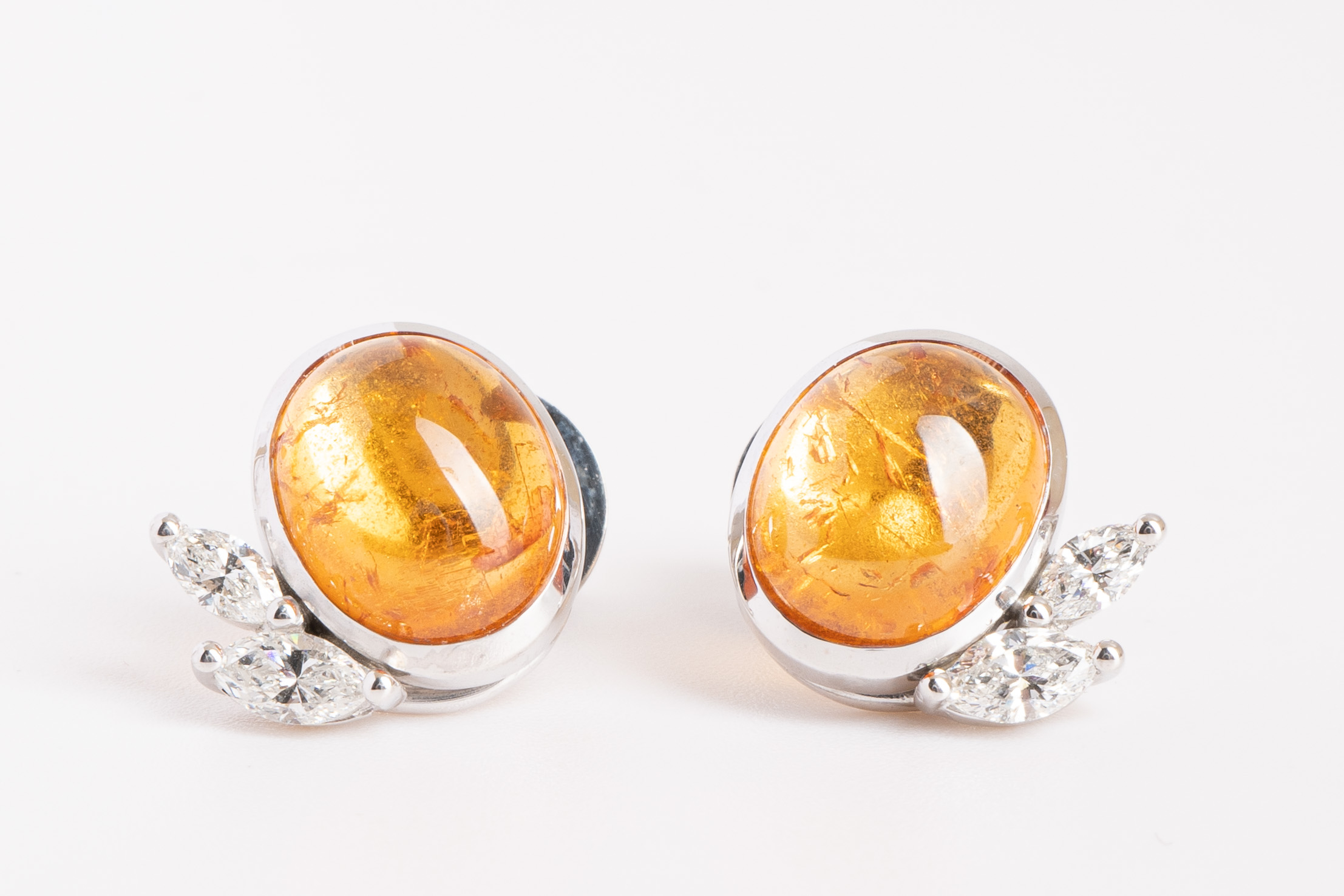 Atelier Heldwein “La Fleur” Mandarin Garnet Stud Earrings 3.7g 750/000 White Gold 1 Mandarin Garnet Cabochon 7.79ct. 4 diamonds marquise total 0.40ct.