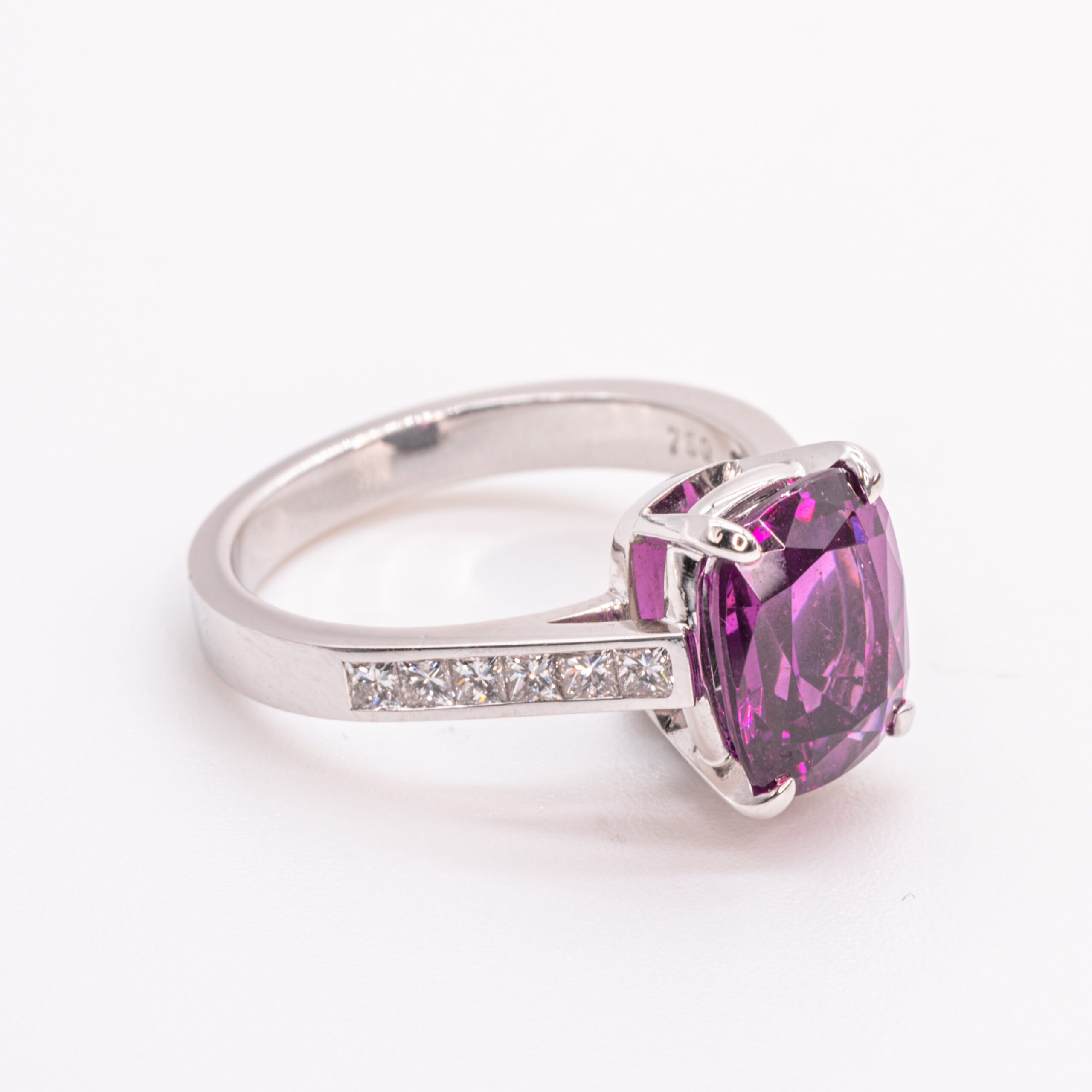Atelier Heldwein “Princess” Ring with Royal Purple Garnet 18 Karat/- White Gold 6.48g 1 Royal Purple Garnet Purple Cushion 4.40ct. 12 Diamond G VS1 Princess 0.56ct. Ring size 55