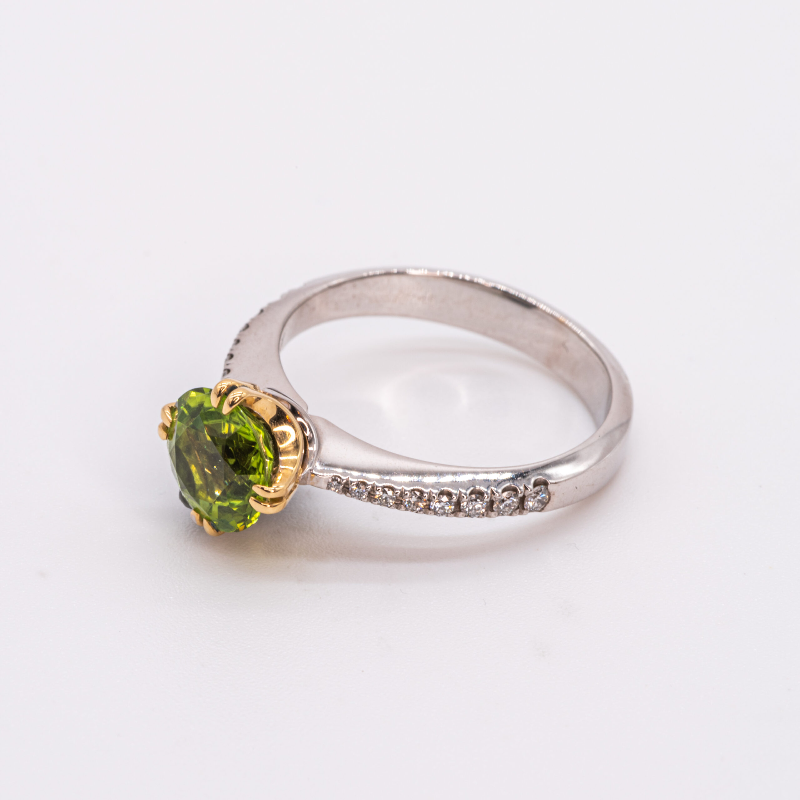 Atelier Heldwein „1902“ Ring mit Peridot und Diamanten 18 Karat/- Weißgold 4,51g 1 Peridot 1.90ct. 16 Diamant F VVS Brillant 0.14ct. Ringgröße 57