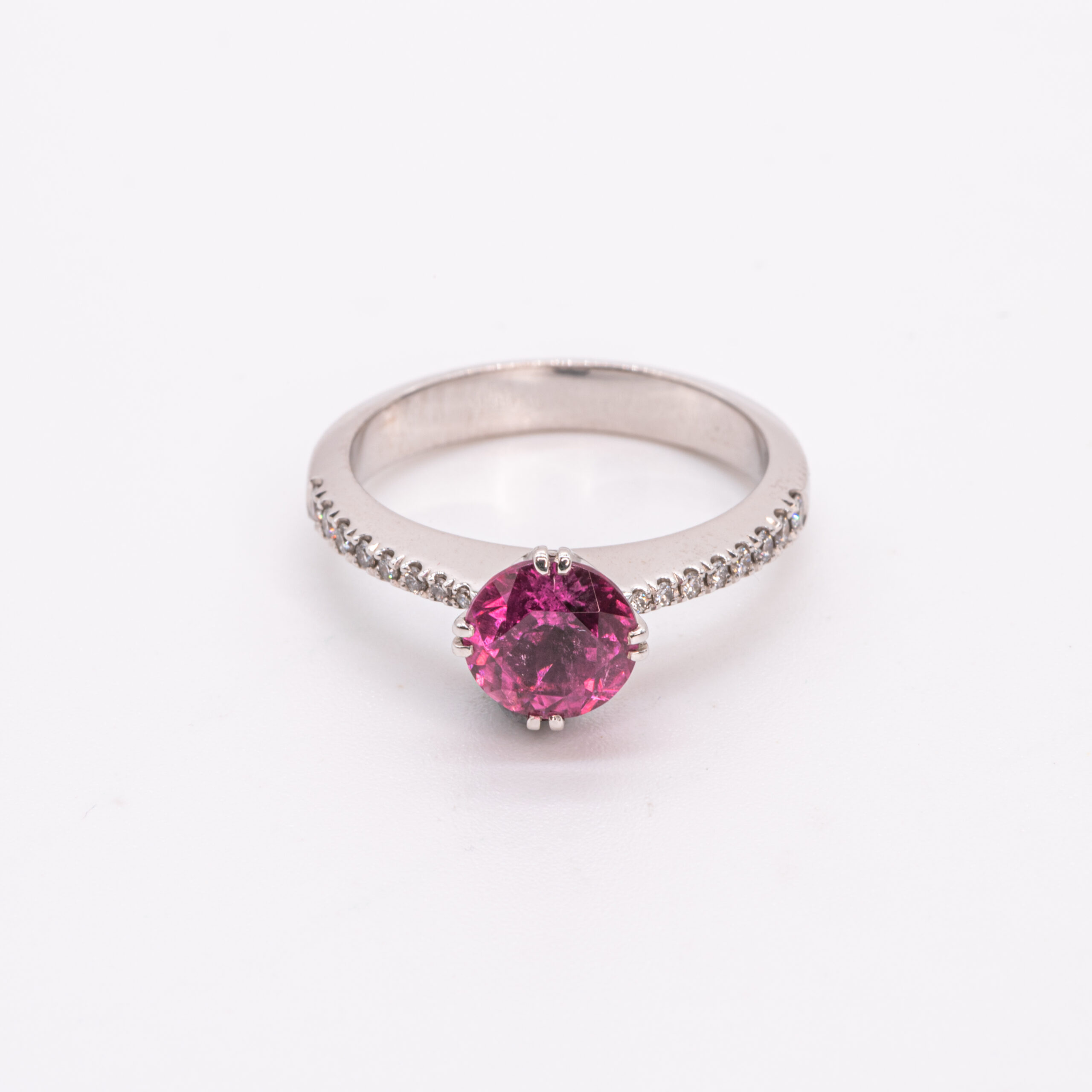 Atelier Heldwein „1902“ Ring mit Rubellit und Diamanten 5,2gr. Weißgold 750/000 1 Rubellit Pink Brillantschliff 1.27ct. 16 Diamant F/G VVS Brillant 0.14ct. Ringgröße 53